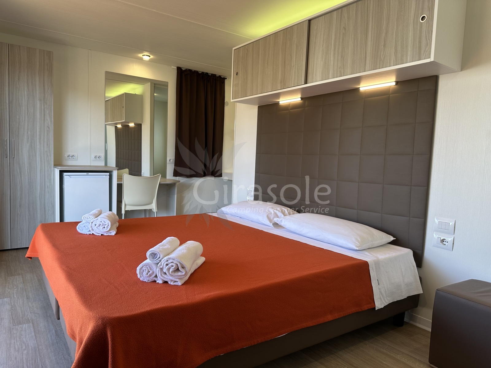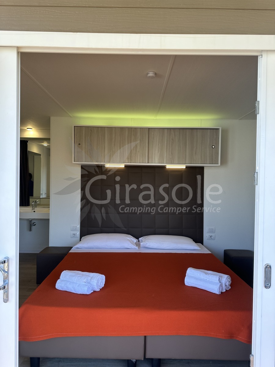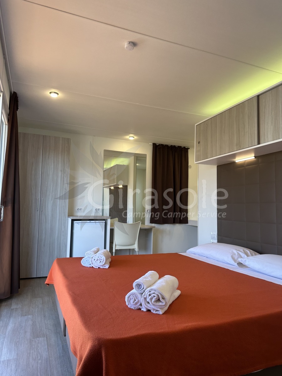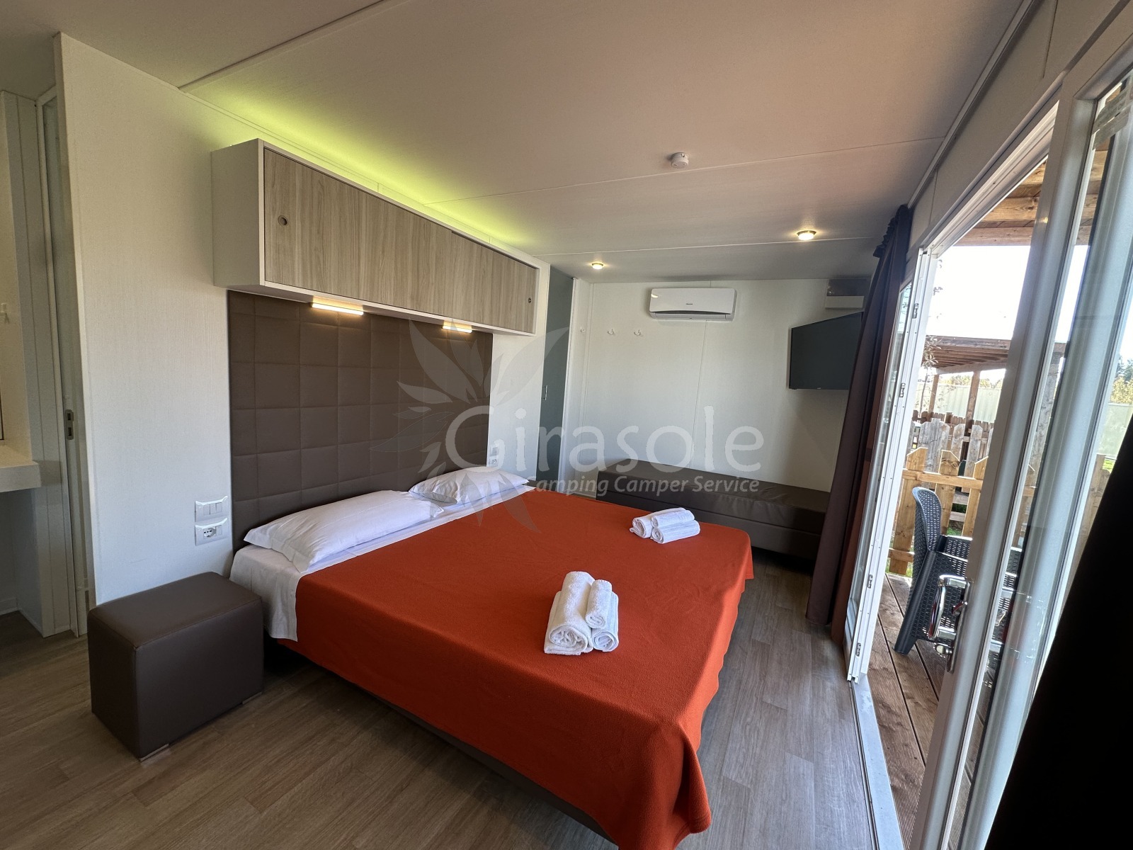 Perfetta per chi cerca una sistemazione simile a quella di una camera d’albergo ma con l’aggiunta di tranquillità e privacy, questa mobile home è dotata di aria condizionata, TV e frigorifero per garantire il massimo del comfort. Il divano letto la rende particolarmente adatta per famiglie con bambini piccoli, che possono godere di uno spazio accogliente e sicuro, senza rinunciare alla qualità e al comfort di una vera camera d’albergo.